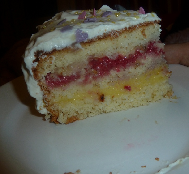 Olen innostunut leipomisesta lähiaikoina, ja eilen tein elämäni toisen täytekakun ihan vain tekemisen ilosta. Kakku sai hyväksynnän myös tämän talouden toiselta osapuolelta, rakkaalta Edittiolmiltani. Täytteenä kerros vaniljakreemiä, ja toinen kerros murskattua vadelmaa ja banaania. Päällä kermaa ja erilaisia koristeita. Nom. :3